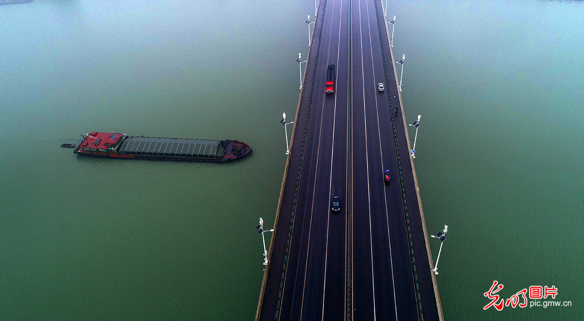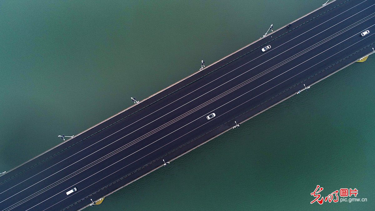 东津渡大桥的建成通车,有效改善了淮河两岸的出行便利。1977年7月,时隔3年,在距此20多公里的潘集区平圩镇,全长3428.5米的公路两用桥——淮南淮河大桥(俗称平圩大桥)开工建设。这座建设周期长达6年的特大桥,也是淮河上第一座最长的铁路、公路两用桥。它的建成通车,是淮南市“淮河大跨越”的历史见证和重要成果。图为2019年4月21日,无人机航拍横跨淮河支流——东淝河上的东津渡大桥。(光明网记者 季春红摄/光明图片)