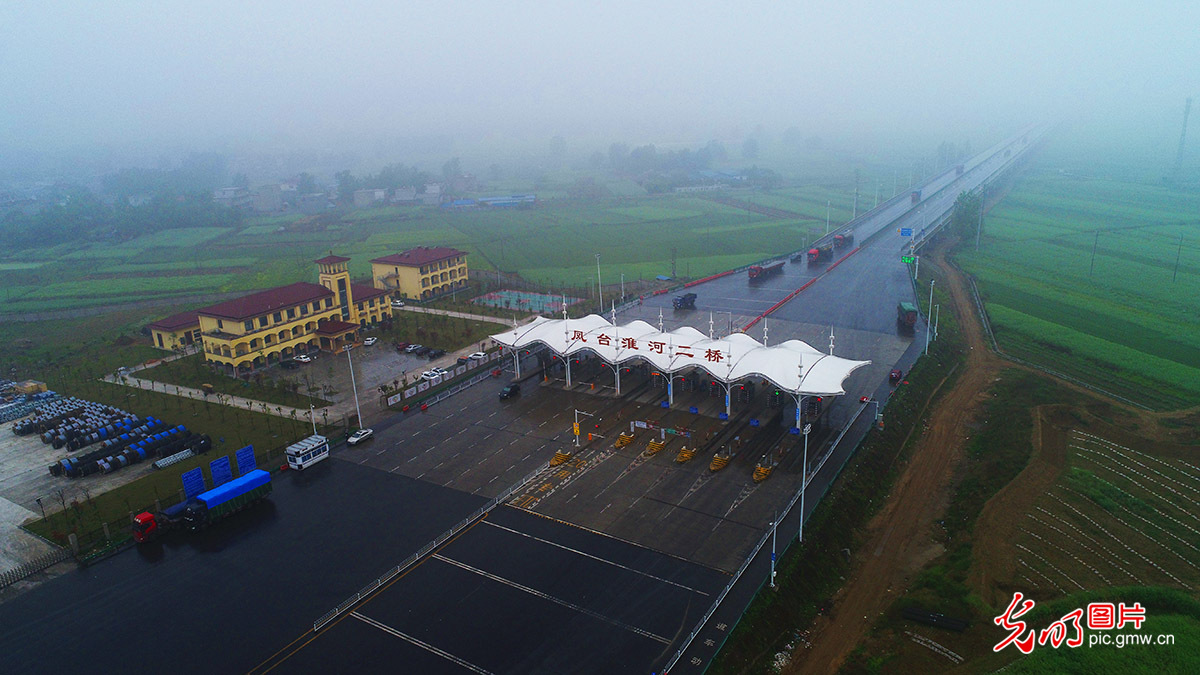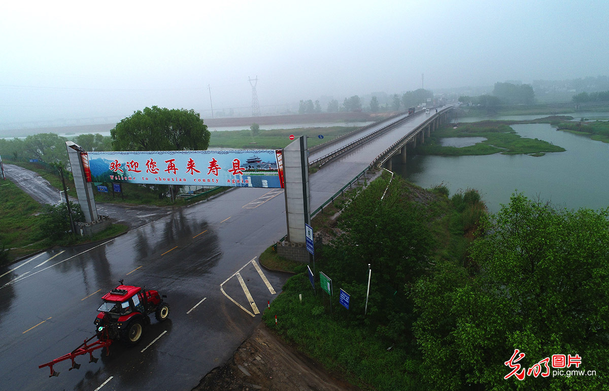 2013年4月25日,在与凤台淮河大桥直线距离不到5公里的地方,耗资8.63亿,总里程为5.253公里,双向六车道的凤台淮河公路二桥开工建设。这是继凤台淮河大桥建成23年后,当地在秦淮河上建立的又一个标志性公路大桥。它的起点位于谢郢村西侧南湖大道与乡道085的交叉口,终点位于李冲回族医院接省道S102路线。2016年7月1日试通车后的凤台淮河二桥成为淮南经济增长的又一条重要的大通道。图为2019年4月21日,无人机航拍蒙蒙细雨中的凤台淮河二桥。(光明网记者 季春红摄/光明图片)