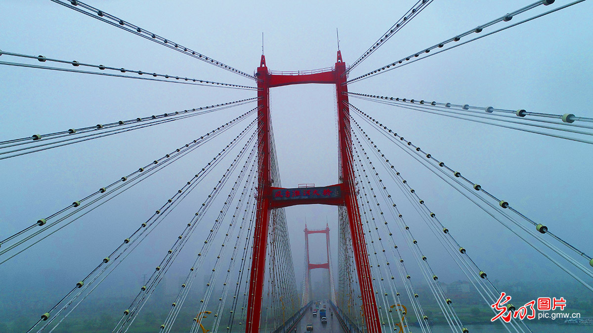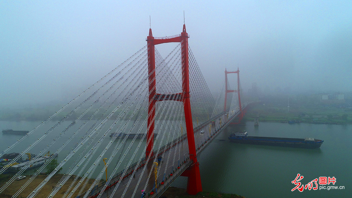 1990年5月1日,“国际劳动节”那一天,成千上万的人们欢呼雀跃地汇聚在凤台县庆祝大桥通车。百姓称赞:“长桥高悬贯苍穹,枕城担山倍峥嵘。索塔耸插云端里,斜缆映嵌龙潭中。关津昔日路坎坷,州来今朝换新容。车如星群奔流过,人若雁行翱碧空。”图为2019年4月21日,无人机航拍蒙蒙细雨中的凤台淮河二桥。(光明网记者 季春红摄/光明图片)
