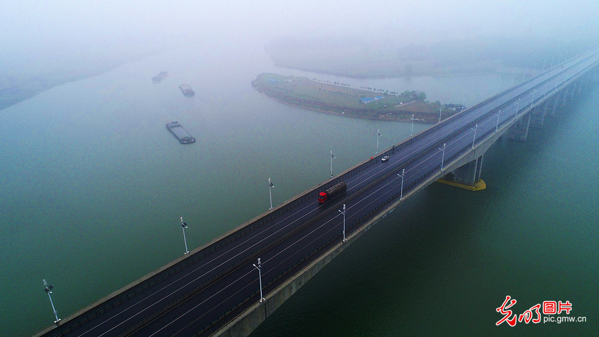 新中国成立以来,曾先后在此区域建设多座大桥穿越淮河(东津渡大桥、淮南淮河大桥、凤台淮河大桥、凤台淮河二桥、孔李淮河大桥、商合杭高铁寿县跨淮河特大桥、淮上淮河大桥,其中后两座为在建特大桥),为推动淮南及相邻区域的经济发展,起到了不可估量的推动作用。图为2019年4月21日,无人机航拍细雨中的凤台淮河二桥。(光明网记者 季春红摄/光明图片)