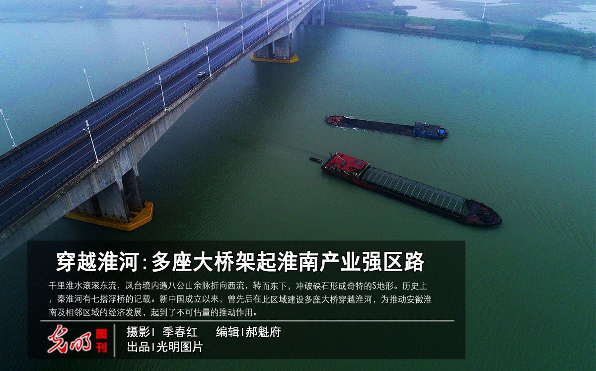安徽省淮南市位于淮河中游,是全国13个主采煤区之一,华东能源基地。70年代,淮南淮北煤矿业兴起,因为交通状况欠佳使得华东地区、皖西北、豫晋陕区域之间的运输严重受阻。区域内,淮河两岸交通主要依赖于轮渡转驳。遇特殊雨雪雨雾天气,常常拥堵不堪,所需物资滞留于运输途中,商旅出行难来难往,不仅耽误时间还容易误事。兴建路桥发展交通路网摆上了政府工作的重要日程。图为2019年4月21日,无人机航拍横跨淮河支流——东淝河上的东津渡大桥。(光明网记者 季春红摄/光明图片)