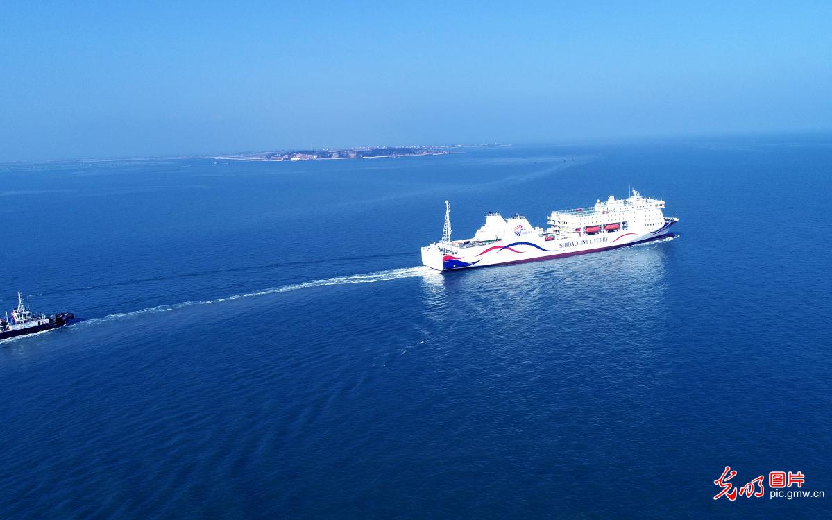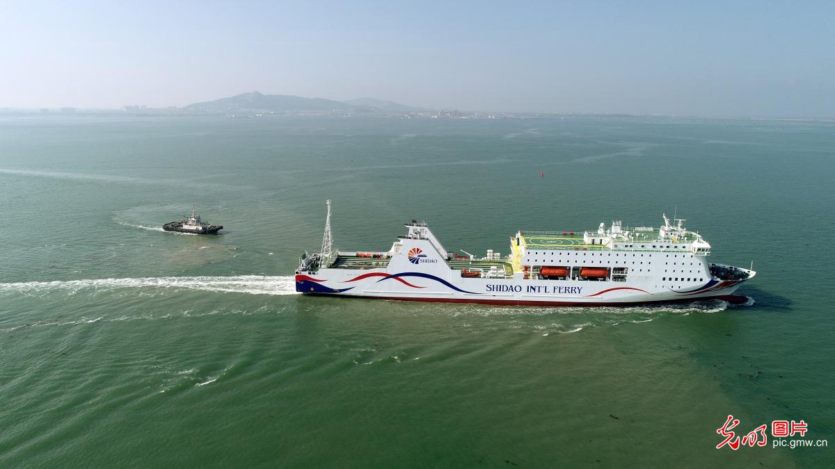 2019年6月24日,中韩航线豪华客滚船"群山明珠"驶离山东省荣成市石岛管理区石岛新港,正式投入运营。"群山明珠"轮由山东黄海造船建造,投入运营后与现有"新石岛明珠"轮共同执航山东荣成石岛至韩国群山航线。(杨志礼摄/光明图片)