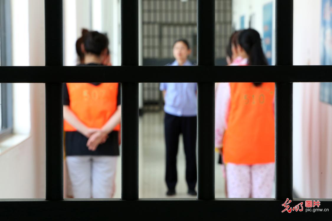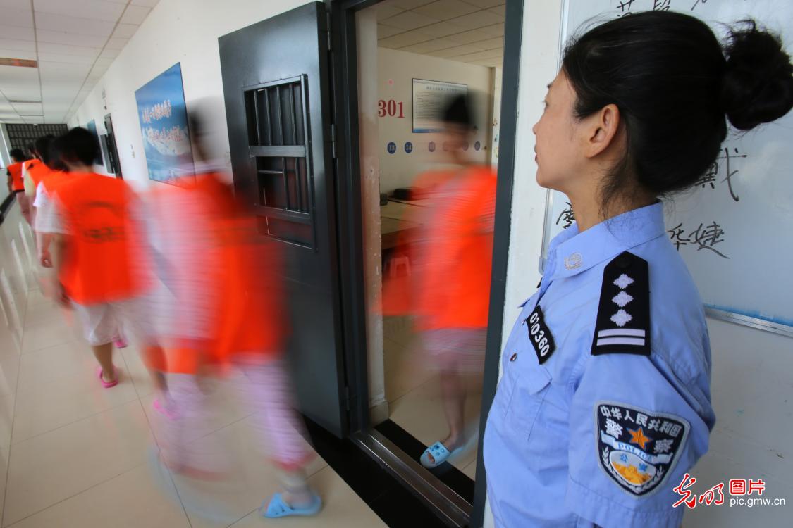 “‘体瘾’易除,‘心瘾’难戒。”周雯表示,戒毒人员一般十多天左右能够克服生理不适,生理上脱离对毒品的依赖,经过入所教育和行为养成教育,更大的精力和时间要放在康复巩固治疗上。图为2019年6月18日,周雯在教新到的学员整理内务。(郑永波摄/光明图片)