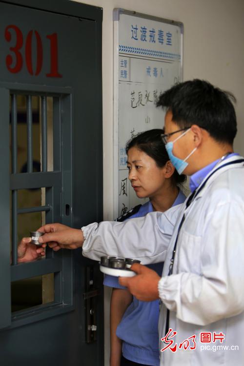 最终,张某在入所绝食后的第四天打开了话匣子,向周雯倾诉了自己吸毒的原因。原来张某在网上被诱骗到连云港后吸毒,期间遭受百般折磨,对生活完全失去了信心。了解情况后,周雯开始有的放矢地为张某做起了思想工作,向他讲述了有类似情况的学员,经过治疗后都重返社会过上了健康生活。在周雯的开导下,张某积极配合起戒毒治疗。图为2019年6月18日,周雯陪同医生给学员送药。(郑永波摄/光明图片)
