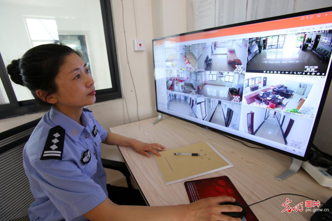 在戒毒所工作的日子里,周雯和这些学员们朝夕相处,照顾她们的生活起居,感受着她们的喜怒哀乐。图为2019年6月18日,周雯通过监控视频了解监区内学员们日常情况。(郑永波摄/光明图片)