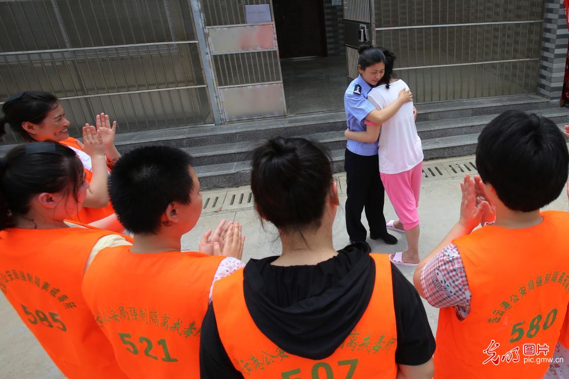 “周管教,谢谢您这段时间对我的关心,让我满怀阳光走出人生的最低谷,重新回到家人的身边,拥抱健康的生活。请您放心,从此以后我一定会珍爱生命,远离毒品。”周雯说,这是她收到的最暖心的短信。图为2019年6月18日,戒毒成功即将离开戒毒所的学员与管教周雯相拥而别。(郑永波摄/光明图片)