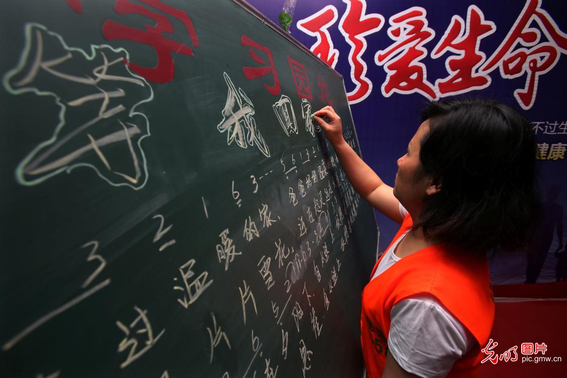 在长达22年的管教生涯中,周雯前前后后一共送走了100余名戒毒成功的学员。用她的话说,作为一名管教干警要有一份责任和担当,帮助每一位戒毒学员戒毒成功,尽早回归社会和家庭,就是自己最大的心愿。图为2019年6月18日,一名学员在小黑板上抄写《等我回家》的曲谱和歌词。(郑永波摄/光明图片)