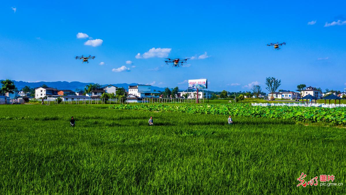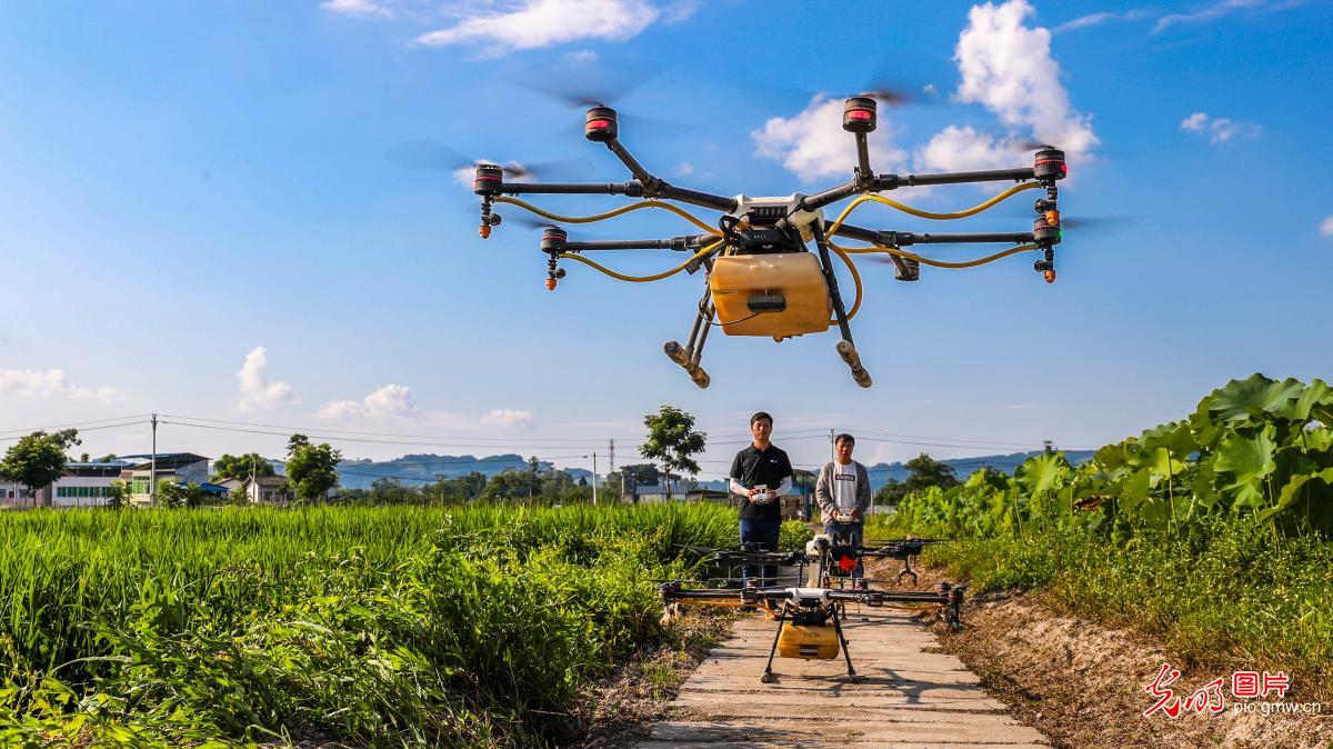2019年7月10日,重庆市梁平区梁山街道八角社区,技术人员在操控植保无人机。随着气温升高,水稻病虫害也进入高发期。梁平区组织专业技术团队对全区40多万亩水稻全面开展防病、防虫和喷洒叶面肥植保作业,确保水稻丰产丰收。(高小华摄/光明图片)