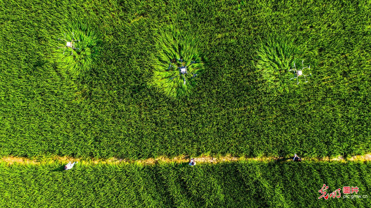 2019年7月10日,技术人员操控植保无人机在重庆市梁平区梁山街道八角社区开展水稻病虫害防治作业。随着气温升高,水稻病虫害也进入高发期。梁平区组织专业技术团队对全区40多万亩水稻全面开展防病、防虫和喷洒叶面肥植保作业,确保水稻丰产丰收。(高小华摄/光明图片)