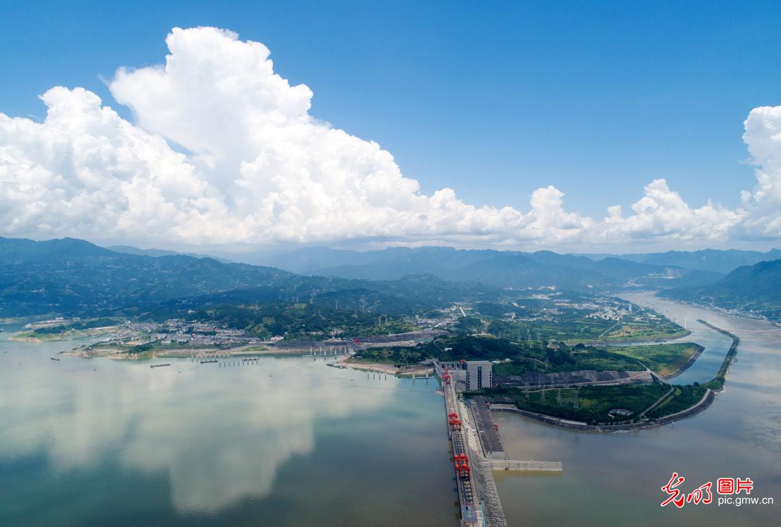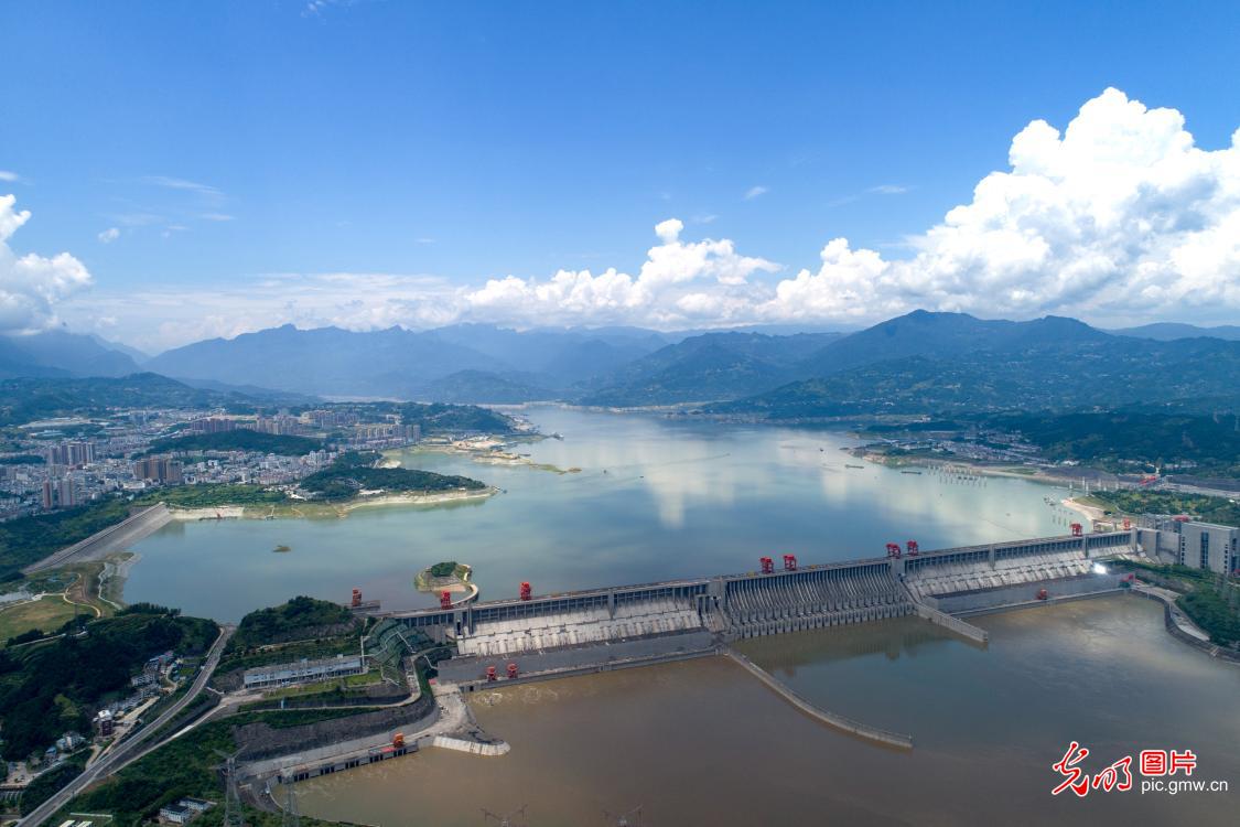 2019年7月24日,在湖北省宜昌市秭归县无人机拍摄的三峡大坝景色。盛夏时节,长江三峡大坝生态屏障区域内青山绿水,蓝天白云,水天一色,大美如画。(王罡摄/光明图片)