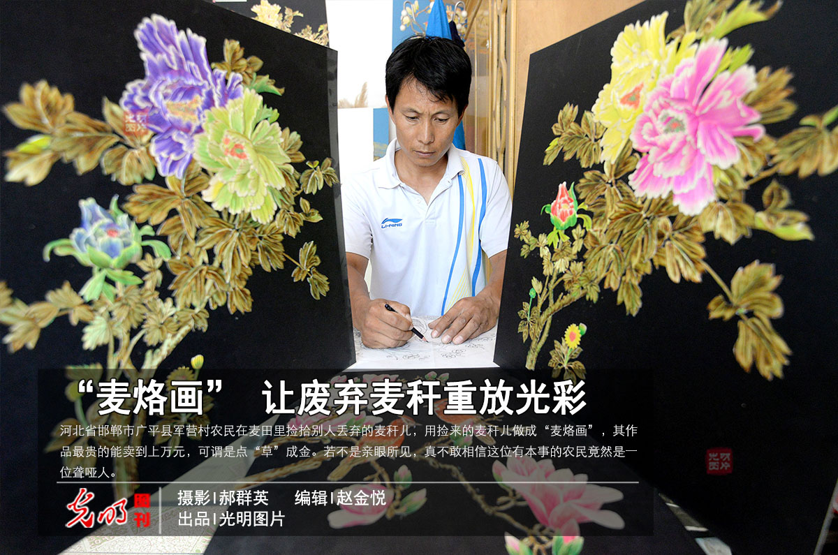 河北省邯郸市广平县军营村农民在麦田里捡拾别人丢弃的麦秆儿,用捡来的麦秆儿做成“麦烙画”,其作品最贵的能卖到上万元,可谓是点“草”成金。若不是亲眼所见,真不敢相信这位有本事的农民竟然是一位聋哑人。