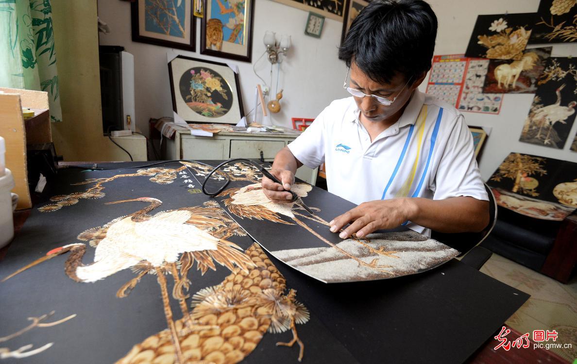 今年48岁的郭顺岭是河北省邯郸市广平县军营村的一名农民,两岁时的一场大病导致他成为聋哑人。自幼喜欢画画的郭顺岭从2013年开始研创"麦烙画"。图为郭顺岭在创作“麦烙画”。(郝群英摄/光明图片)
