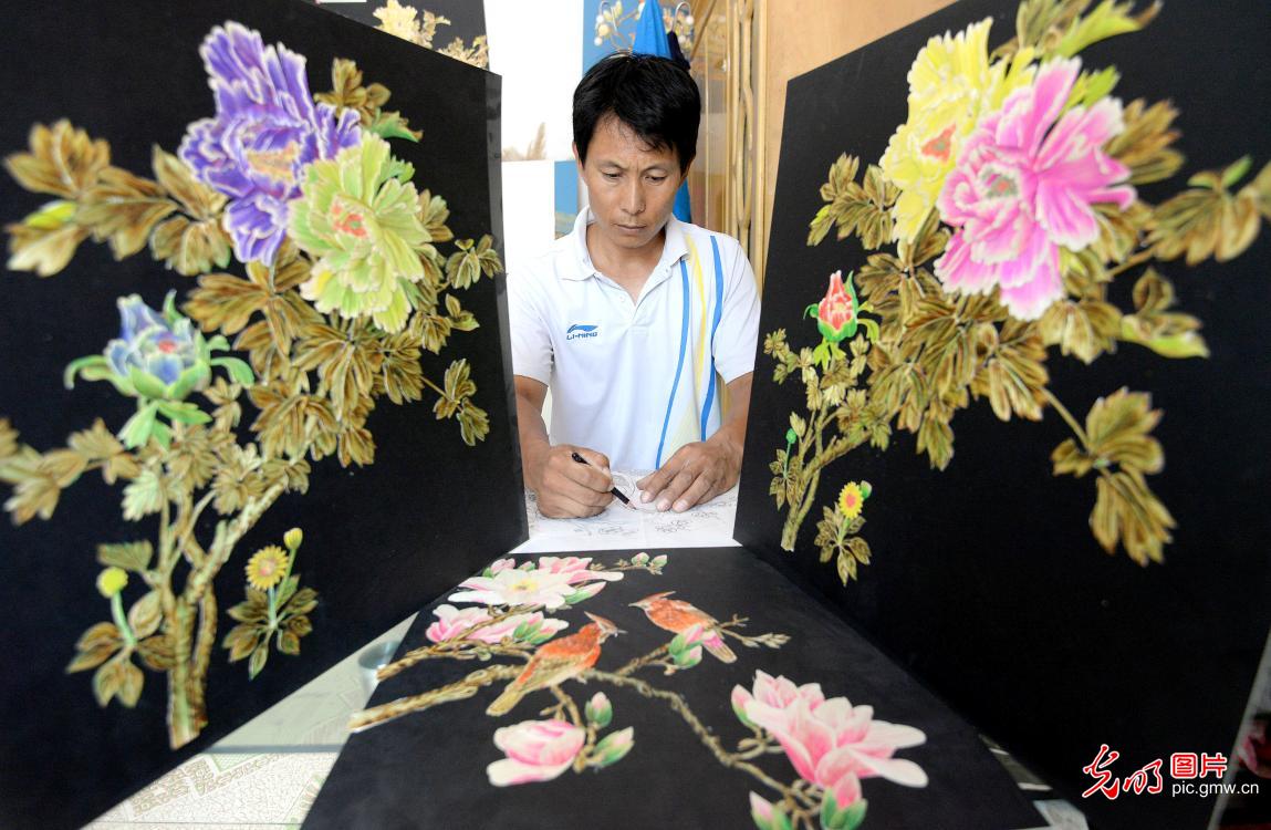 正是因为郭顺岭有着扎实的绘画功底,在学习麦秆画期间,他得心应手,在短时间内掌握了创作麦秆画技巧。图为郭顺岭在绘制“麦烙画”图纸。(郝群英摄/光明图片)