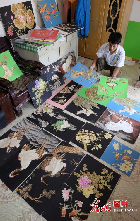 目前,郭顺岭已创作完成2000多幅"麦烙画"作品,题材以人物、花草、鸟兽为主,价格从200元到上万元不等,让废弃的麦秆重放光彩。图为郭顺岭在观看自己创作的"麦烙画"。(郝群英摄/光明图片)