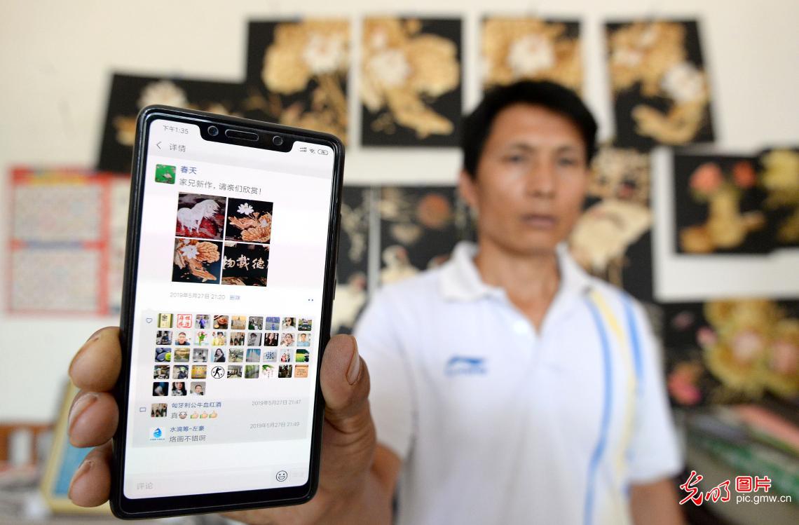 郭顺岭希望更多人投身到“麦烙画”艺术中来,充分发掘和利用“麦烙画”,使之产业化、商品化,产生良好的文化价值和经济价值,为当地农民带来实惠。图为郭顺岭展示其弟弟的手机朋友圈,郭顺岭的“麦烙画”作品通过弟弟进行对外销售。(郝群英摄/光明图片)
