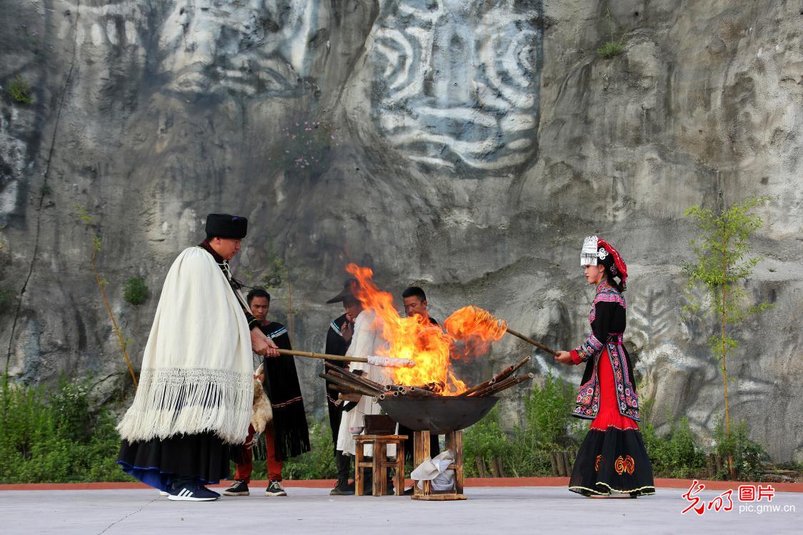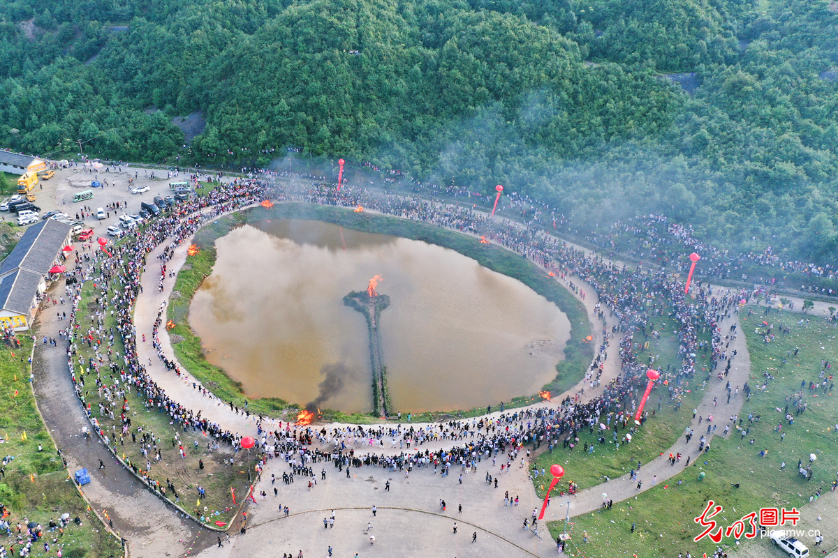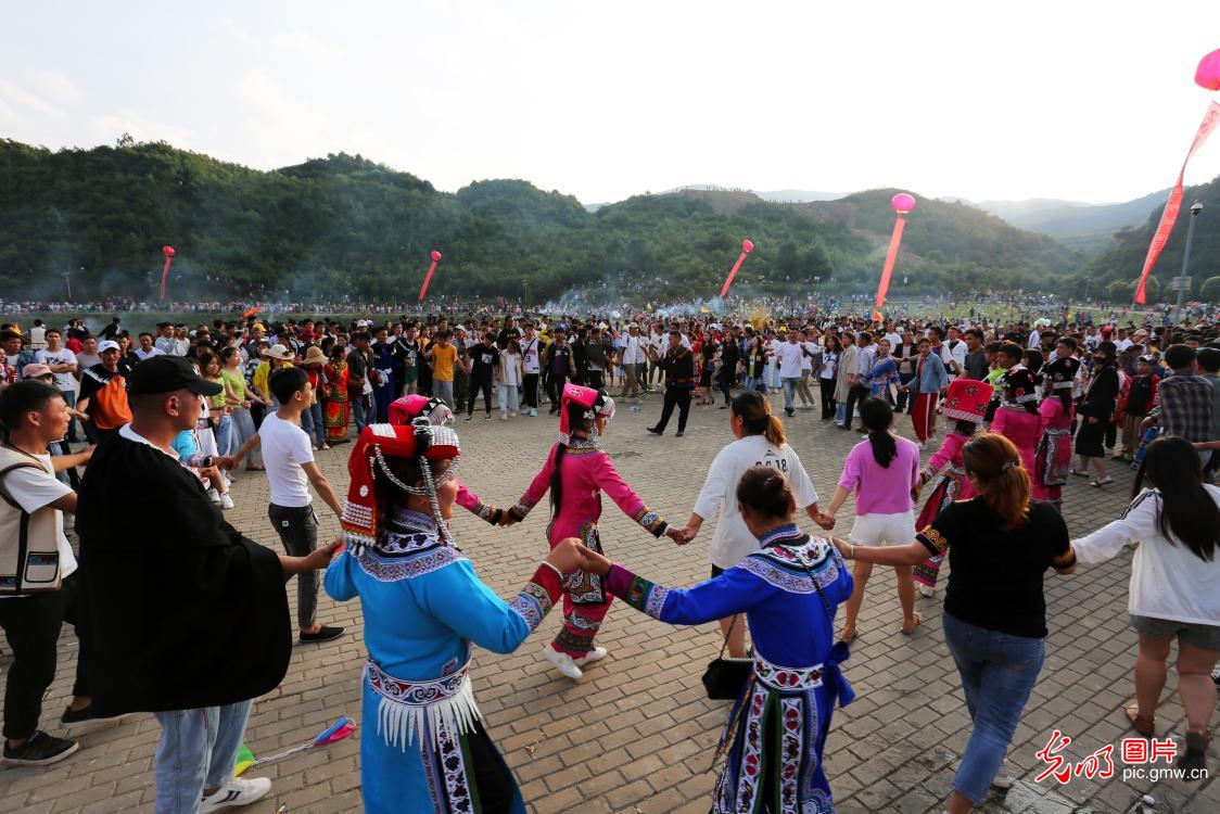 2019年7月26日,在贵州省毕节市威宁县板底乡,人们载歌载舞,欢度"火把节"。彝族"火把节"是彝族地区的传统节日,每年农历六月二十四日举行。(何欢摄/光明图片)
