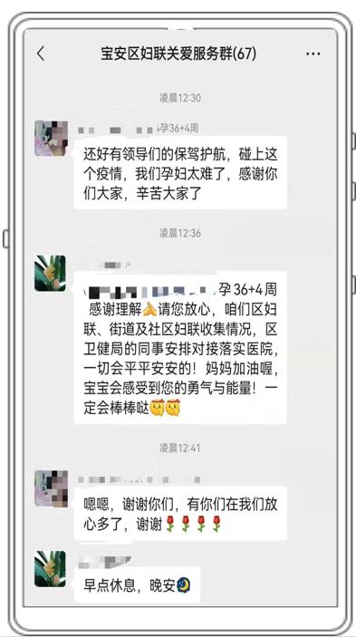 宝安妇联防疫“安心”热线专班建立微信群,通过与街道、社区联动,全面摸底排查管控区内的孕产妇、儿童等需要重点关注的人群,建档立卡,确保精准服务。