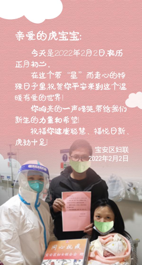 2日当天,宝安区妇联主要负责同志还带队为产妇和新生虎宝宝送去暖心礼品和慰问信,致以问候和祝福。