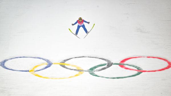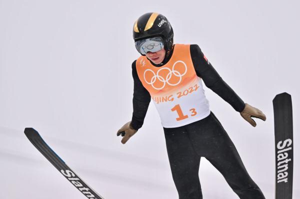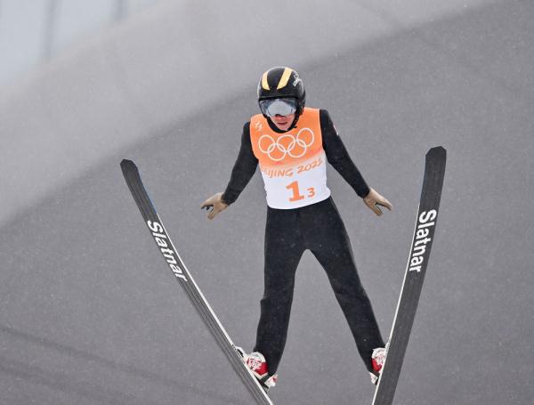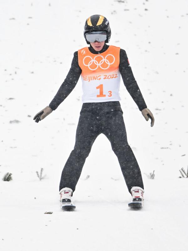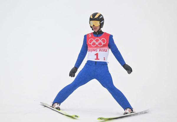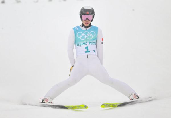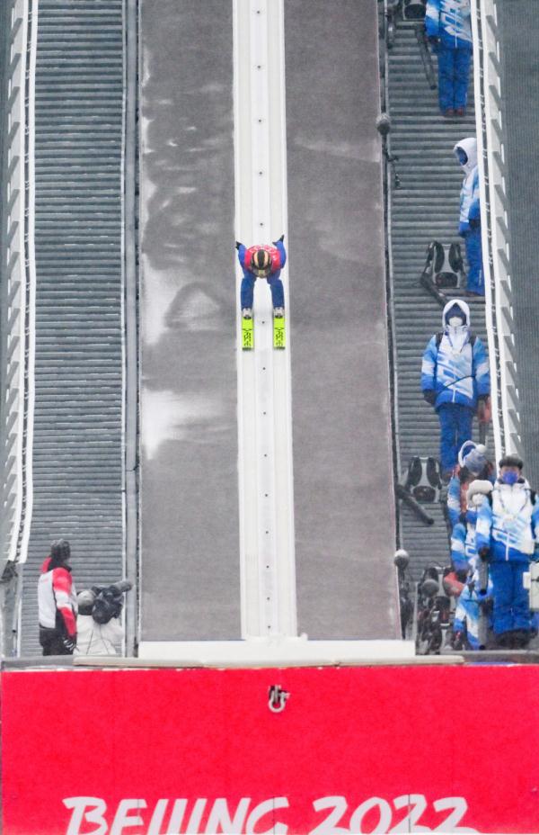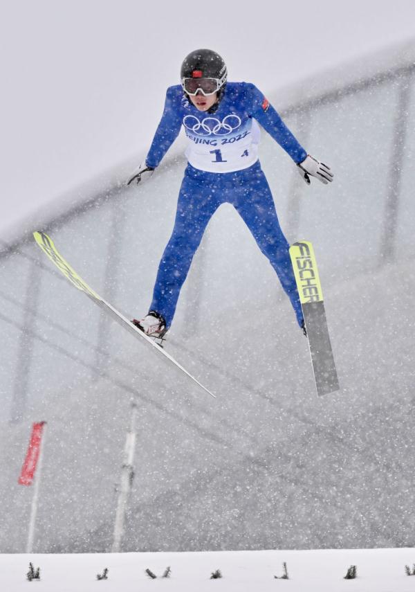 ↑中国队选手赵嘉文在跳台滑雪比赛中。新华社记者 朱峥 摄