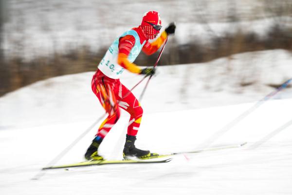 ↑中国队选手范海斌(右)在越野滑雪比赛中冲线。新华社记者 戴天放 摄