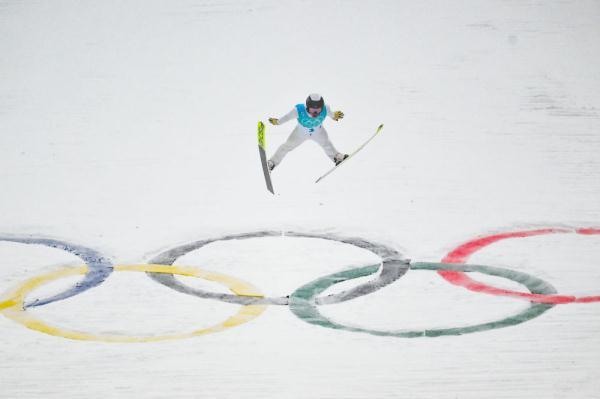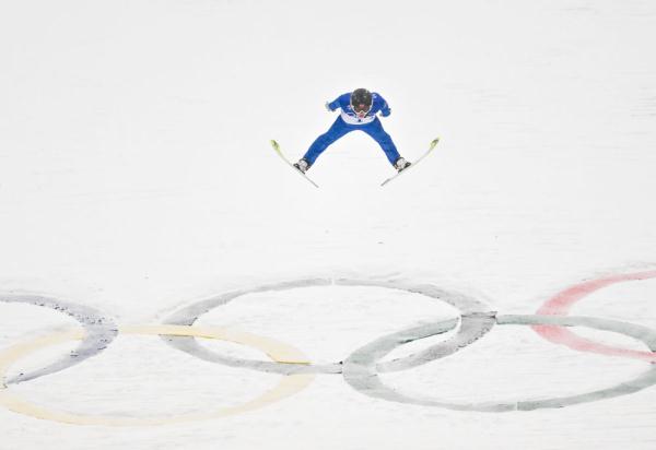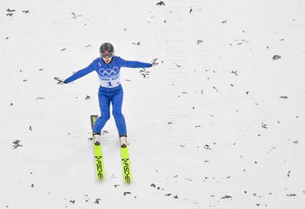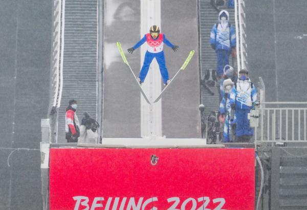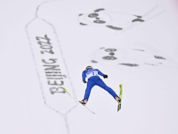 ↑中国队选手赵嘉文在跳台滑雪比赛中。新华社记者 姜克红 摄