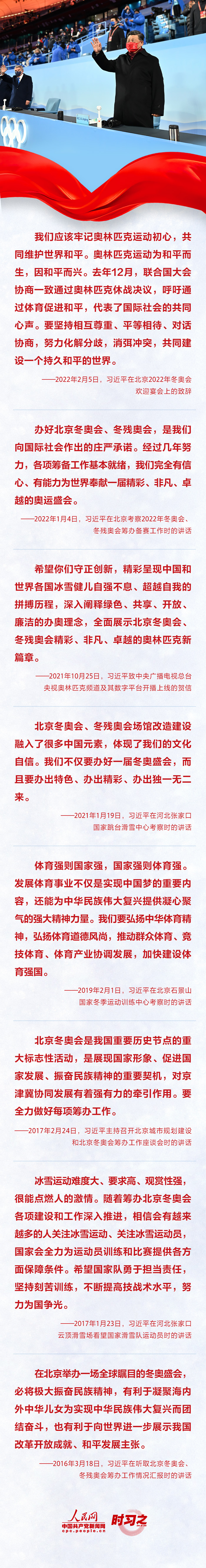 2022年2月20日晚,2万盏灯笼点亮国家体育场,“中国红”与“冰雪白”交相辉映,举世瞩目的北京冬奥会在运动员们的欢乐聚会中落下帷幕。冬奥竞技场上,一个个精彩瞬间、一幕幕动人场景,使人心潮澎湃。同筑冰雪梦,一起向未来。让我们重温习近平的铿锵话语,共同感受体育传递出的强大精神力量。
