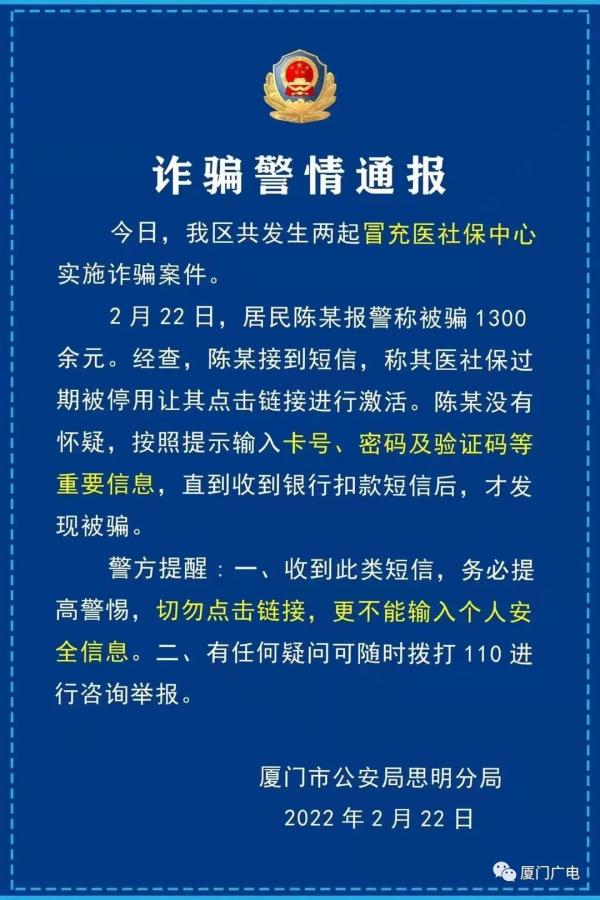 近日,厦门市民陈某收到医社保过期短信