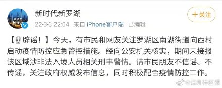 3月3日晚,@新时代新罗湖辟谣称,有市民和网友关注罗湖区南湖街道向西村启动疫情防控应急管控措施。经向公安机关核实,期间未接报该区域涉非法入境人员相关刑事警情。请市民朋友不信谣、不传谣,关注政府权威发布信息,同时积极配合疫情防控工作。(新时代新罗湖)