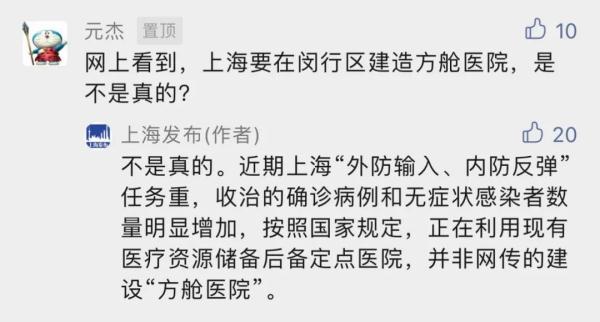 近期,上海出现本土新冠确诊病例。3月3日,微信公号“上海发布”发布《松江与普陀的病例是否有关联?接到流调人员的电话该怎么配合?今天的发布会详解》一文,有网友在评论区询问:网上看到,上海要在闵行区建造方舱医院,是不是真的?