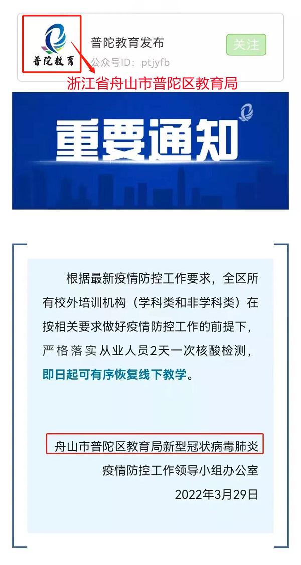 记者从上海普陀区教育局了解到,此“普陀教育”非上海的“普陀教育”,校外培训机构恢复线下教学是误传。