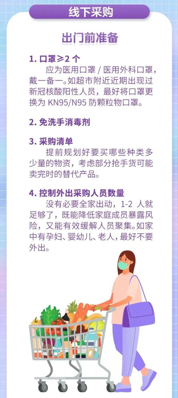 上海疾控提醒:尽量采用线上购物方式。如果确有需要线下采购,出门前应准备免洗手消毒剂,以及至少2个医用口罩或医用外科口罩,戴一备一。如超市附近近期出现过新冠核酸阳性人员,最好将口罩更换为KN95、N95防颗粒物口罩。