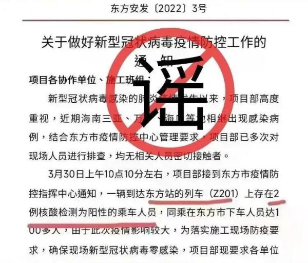 据悉,3月30日,网传“3月30日上午10点10分左右,项目部接到东方市疫情防控指挥中心通知,一辆到达东方站的列车(Z201)上存在2例核酸检测为阳性的乘车人员,同乘在东方市下车人员达100多人”。这消息一传出,对东方群众的生活造成影响。该市新型冠状病毒肺炎疫情防控指挥部经过核实,确认为谣言。
