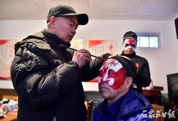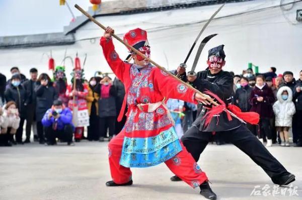 在井陉县有个武术村——桃林坪,村里几乎人人会武术、个个有功夫。数百年来,村子里流传着一种特有的花脸社火,上至耄耋老人、下至学龄前儿童,都会来上一段。尤其是春节期间,每当鼓点响起,他们都会放下碗筷,脸上画上不同的脸谱,拿起刀枪棍棒,跟着社火队伍一起跑阵。