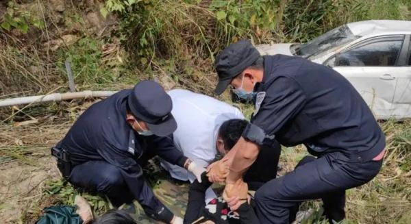 事发地的悬崖高约100余米,事故车辆在坠崖过程中被卡在悬崖三分之二处的深沟内,被困车辆旁都是悬崖峭壁,且周围被茂密的灌木覆盖,要实施救援,就必须徒手攀爬,而车辆所在位置下方还有20余米深的悬崖,稍有不慎,车辆极有可能再次坠崖!“不能再等了,时间就是生命,我们从下方爬上去更快些!”困难面前,民警没有丝毫停歇,当即决定从崖底攀爬到车辆被困地,将伤员转移到安全地带。