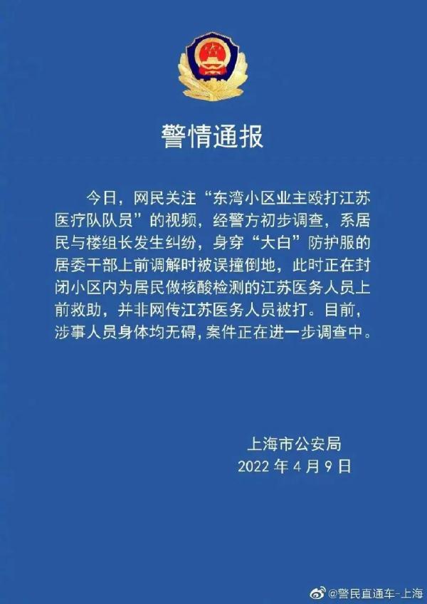经警方初步调查,系居民与楼组长发生纠纷,身穿“大白”防护服的居委干部上前调解时被误撞倒地,此时正在封闭小区内为居民做核酸检测的江苏医务人员上前救助,并非网传江苏医务人员被打。目前,涉事人员身体均无碍,案件正在进一步调查中。
