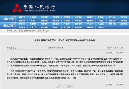 为支持实体经济发展,促进综合融资成本稳中有降,中国人民银行决定于2022年4月25日下调金融机构存款准备金率0.25个百分点(不含已执行5%存款准备金率的金融机构)。为加大对小微企业和“三农”的支持力度,对没有跨省经营的城商行和存款准备金率高于5%的农商行,在下调存款准备金率0.25个百分点的基础上,再额外多降0.25个百分点。本次下调后,金融机构加权平均存款准备金率为8.1%。