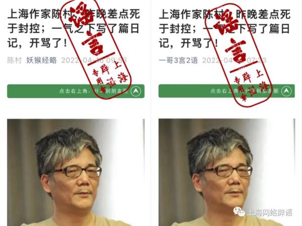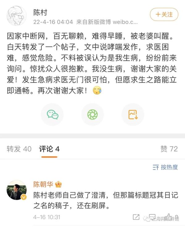 《上海作家陈村,昨晚差点死于封控》,今天热转的公号文让作家陈村的状况备受网友关注。对此,陈村已通过微博、微信朋友圈公开辟谣:“因家中断网,百无聊赖,难得早睡,被老婆叫醒。白天转发了一个帖子,文中说哮喘发作,求医困难,感觉危险。不料被误认为是我生病,纷纷前来询问。我没生病,谢谢大家的关爱!”
