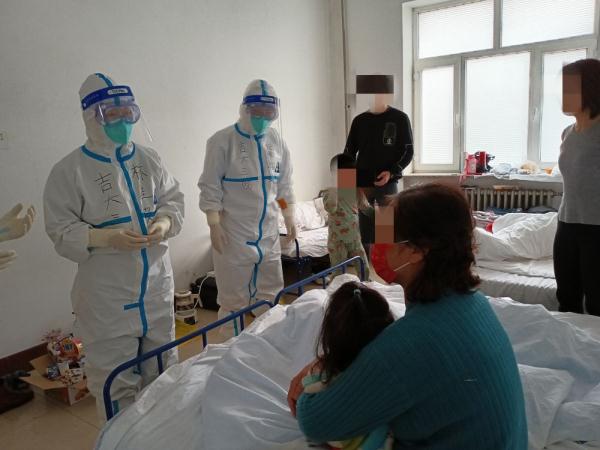 吉林大学中日联谊医院援勇士路方舱医院医疗队的医护人员正与患者交流。(图片由被采访对象提供)