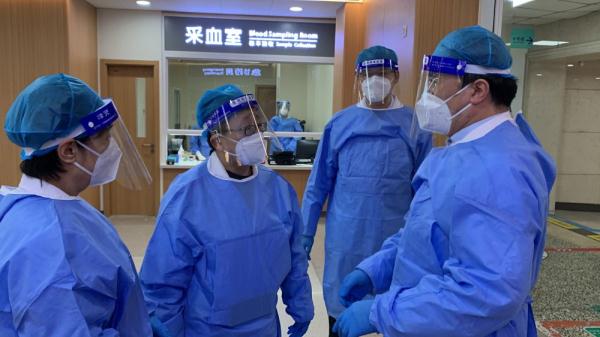 吉林大学中日联谊医院党委书记崔树森(右一)在中心院区急诊疗区内指导工作。(图片由被采访对象提供)