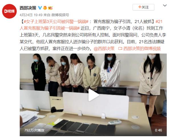 近日,广西南宁,女子小清(化名)找到工作上班第3天,几名民警突然来到公司将所有人控制。面对民警询问,公司负责人李某交代,他招人冒充客服拉人进诈骗分子的群并以此获利。目前,21名违法嫌疑人已被警方抓获,案件正在进一步侦办。