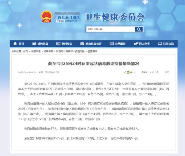 4月25日0-24时,广西新增本土无症状感染者2例(防城港市,在集中隔离人员中发现)。当日解除隔离医学观察本土无症状感染者30例(防城港市26例,崇左市4例)。截至4月25日24时,全区现有本土确诊病例4例(均在百色市),本土无症状感染者231例(防城港市198例,百色市25例,钦州市6例,崇左市1例,南宁市1例)。
