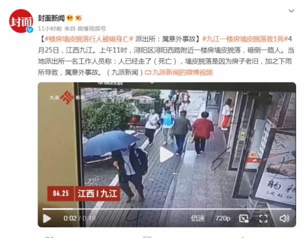 经成都网络辟谣平台检索发现,此事发生于江西九江,并非成都。 封面新闻、九派新闻等媒体于4月25日刊发报道,4月25日上午11时许,江西九江浔阳区浔阳西路附近一楼房墙皮脱落,砸倒一名过路女子。 18时许,当地派出所工作人员称:该女子已确认身亡,事故原因是房子老旧,加之下雨导致墙皮脱落,属意外事故。