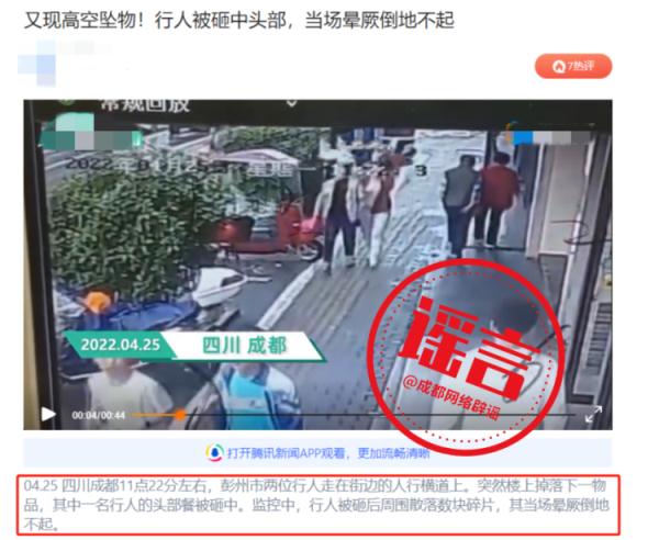 4月25日,一则题为“四川成都高空坠物砸中行人当场倒地不起” 的视频在网络平台扩散传播,视频内容显示“四川成都彭州市两位行人走在街边人行道上,楼上突坠一物品,其中一名行人头部被砸中,当场晕厥倒地不起” ,引发部分本地市民关注并呼吁相关部门做好安全隐患排查工作,也有个别网民质疑事发地非成都。