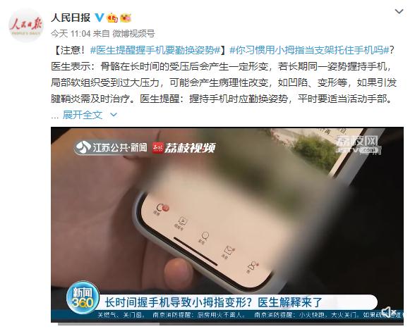 你习惯用小拇指当支架托住手机吗?医生表示:骨骼在长时间的受压后会产生一定形变,若长期同一姿势握持手机,局部软组织受到过大压力,可能会产生病理性改变,如凹陷、变形等,如果引发腱鞘炎需及时治疗。医生提醒:握持手机时应勤换姿势,平时要适当活动手部。