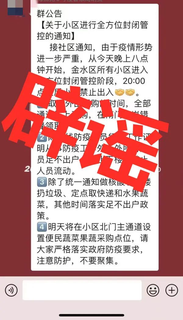 5月8日,网络流传一个消息称,“金水区所有小区进入全方位封闭管控阶段,20:00点之后小区禁止出入……”当天下午,记者向郑州市新冠肺炎疫情防控指挥部和金水区疫情防控指挥部核实后确定,这是个假消息!