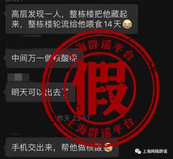 近期,有人在圈群中称,高层楼栋里出现一例阳性感染者,整栋楼把他藏起来,轮流喂食14天,还表示要替阳性感染者做核酸。上海真的存在这样的事情吗?