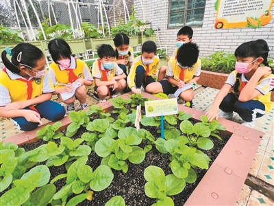 在广州市荔湾区增滘小学,同学们一起将教学楼天台的两片“荒草园”变成了“芳草园”。在这块“芳草园”里面每个年级每个班都有一块“责任田”,这块田将由该班级一直负责种植和管理,直到同学们小学毕业。学校还请来具有相关知识背景的家长,为学生和老师讲授农业种植知识,根据季节变化,小农田种植的花草和蔬果也会有所调整。