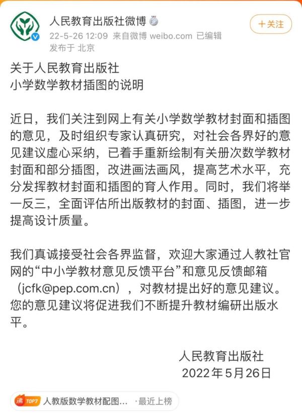 人民教育出版社称,我们真诚接受社会各界监督,欢迎大家通过人教社官网的“中小学教材意见反馈平台”和意见反馈邮箱(jcfk@pep.com.cn),对教材提出好的意见建议。您的意见建议将促进我们不断提升教材编研出版水平。
