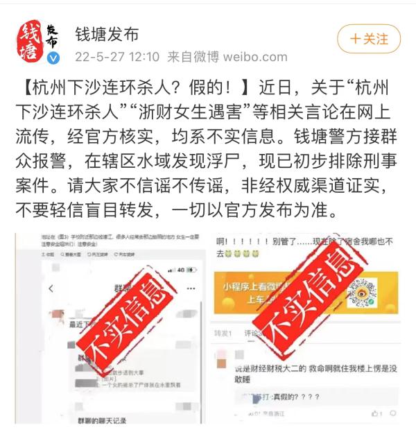 今天浙江杭州市钱塘区发布通报,近日,关于“杭州下沙连环杀人”“浙财女生遇害”等相关言论在网上流传,经官方核实,均系不实信息。钱塘警方接群众报警,在辖区水域发现浮尸,现已初步排除刑事案件。请大家不信谣不传谣,非经权威渠道证实,不要轻信盲目转发,一切以官方发布为准。(总台记者于晨)