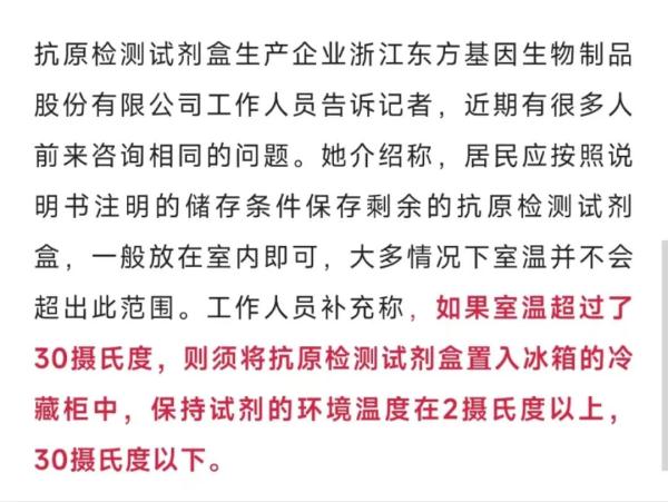 6月1日起,上海进入全面恢复正常生产生活秩序的阶段,市民们家中剩余了不少街道、居委分发的抗原检测试剂盒。有网友向上海辟谣平台后台留言询问,天气逐渐炎热,未使用的抗原试剂该如何保存,是否有必要放入冰箱冷藏。